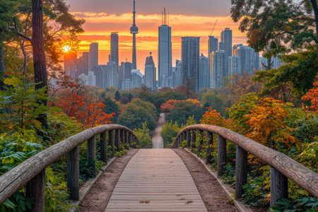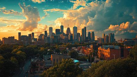 Captivating city skyline during sunset showcases a blend of modern architecture and nature. Warm tones fill the sky, creating a stunning urban landscape.