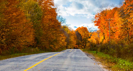 Abandoned empty road street in colorful autumn forest park with yellow orange red leaves on trees. Beautiful fall season outdoors.