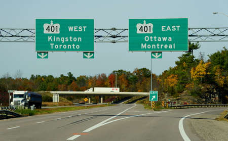 Ontario, Canada - October 28, 2019 - The view of the highway on Route 401 splits with striking fall foliage