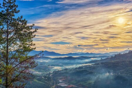 Beautiful landscape sunrise nature background Mountains mist and sky