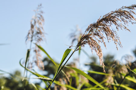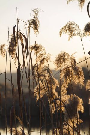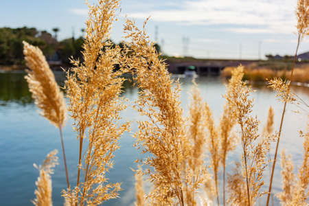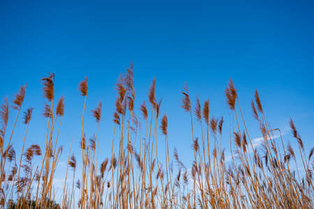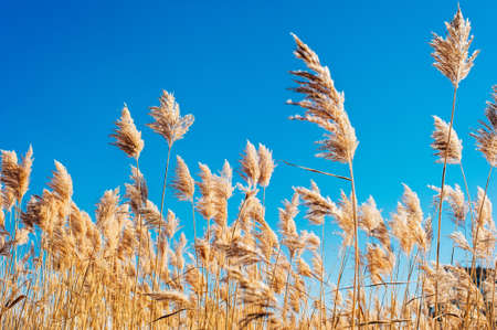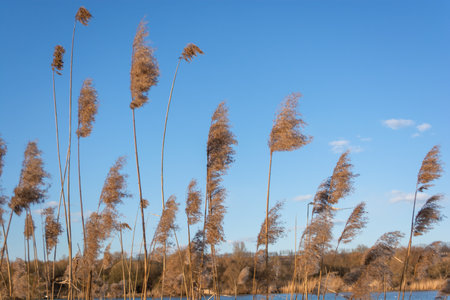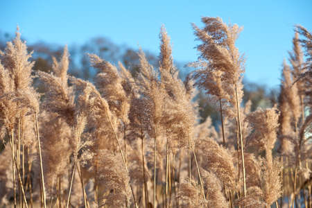 Common Reed (Phragmites australis) close to a lake in sunny autumn light against the blue sky