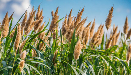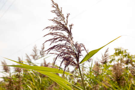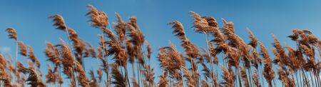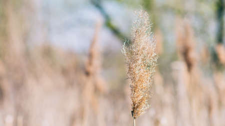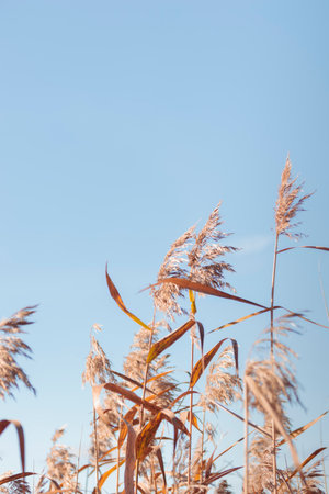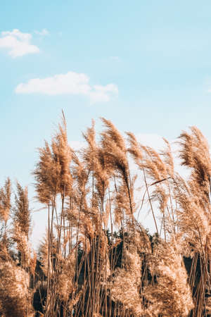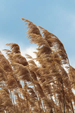 Phragmites australis pretty dried up common reed in autumn waving in the wind near the river dry blue sky pampas soft plant grass outdoor in light pastel colors boho style Panicles