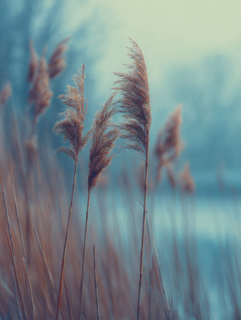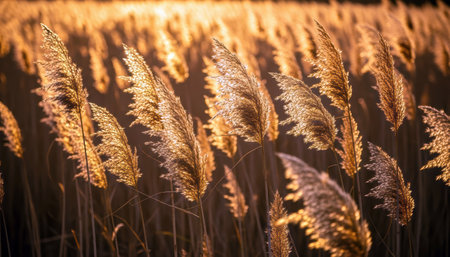 Golden reeds sway gracefully in the breeze, set against a tranquil blurred backdrop of water and nature, evoking a sense of peace and natural beauty.