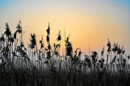 A tranquil winter sunset lake with reed flowers are in bloom. bright colors