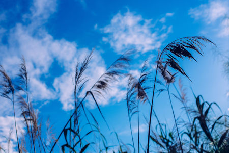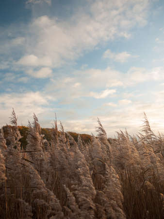 Dry grass flowers blowing in the wind, red reed sway in the wind with blue cloudy sky background, reed field in autumn