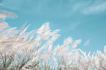 Pampas grass in the sky, Abstract natural background of soft plants Cortaderia selloana moving in the wind.