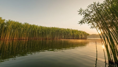 Experience the serene beauty of a misty morning over a tranquil lake, where reeds gently sway in the soft sunlight, creating a peaceful atmosphere in nature.