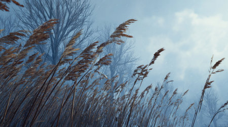 A marshland with mocha mousse-colored reeds swaying in the wind, their smooth textures catching the sunlight. The tranquil scene evokes