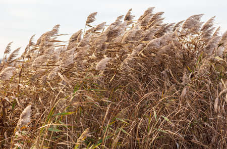 dry stalks of reeds at the pond sway in the wind on an autumn day, Ukraine