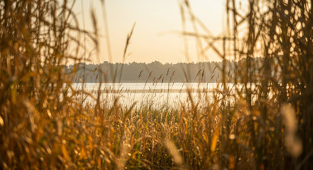 Golden hour light illuminates tall grass by a serene lake with a forest background. Peaceful nature scene, perfect