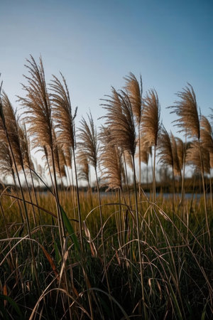 A beautiful view of soft pampas grass gently swaying in the wind, illuminated by warm sunlight under a picturesque blue sky with soft clouds, conveying peace.