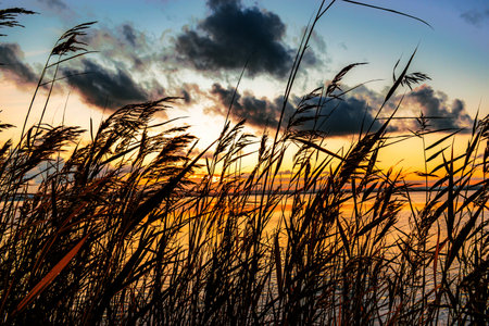 Reeds in sunset macro shot, colorful sky. Nature tranquility and beauty concept