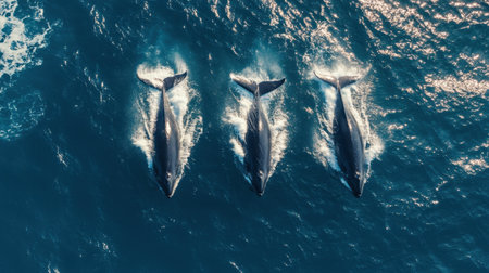 Witness an incredible aerial view of three majestic whales gliding gracefully through the shimmering blue ocean, showcasing nature's beauty.