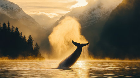 A stunning whale tail emerges dramatically from serene waters, highlighted by a golden sunset backdrop, enhancing the tranquil mountainous landscape.