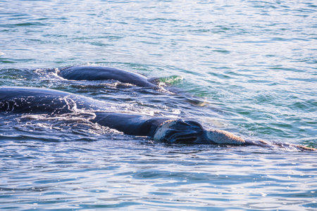 Closeup of a giant southern whale emerging from the cold ocean waters, Hermanus, South Africa