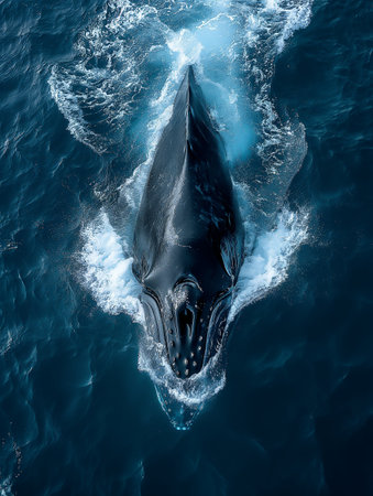 A spectacular aerial view of a whale breaching the oceans surface, sending waves crashing into the surrounding waters.