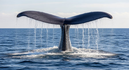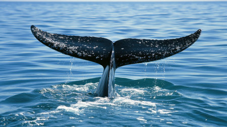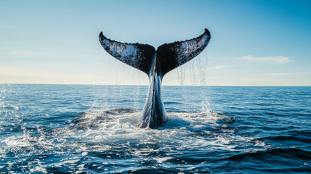 A magnificent whale tail emerges gracefully from the deep blue ocean, splashing water droplets while surrounded by calm waters during a sunny day, evoking a sense of wonder.