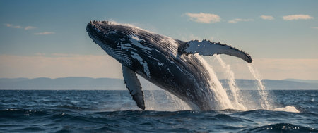 Majestic Humpback Whale Breaching Gracefully Above the Ocean Waves in Sunlit Waters Capturing the Essence of Marine Life and Nature's Wonders