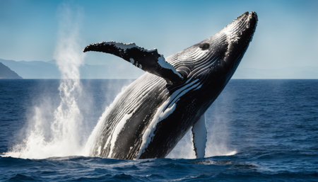A majestic whale breaching the ocean surface with water splashing under the sunny sky.. AI generated.
