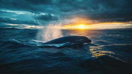 A stunning image of a whale breaching the ocean surface at sunset, creating a mesmerizing scene with dramatic clouds and vibrant colors, showcasing the beauty of marine wildlife.