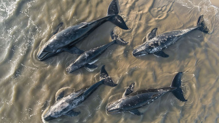 Aerial view of five marine mammals swimming in shallow water, showcasing their graceful movements and natural habitat.