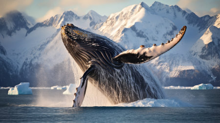 A magnificent whale leaps out of the cold, clear waters, displaying its power against a stunning backdrop of snow-capped mountains and drifting ice.