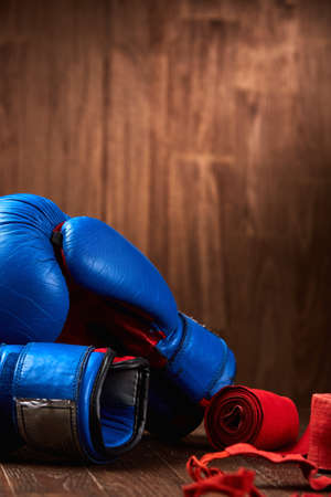 A pair of leather Boxing gloves on a blue background, free space. The concept of fighting and fighting with difficulties.