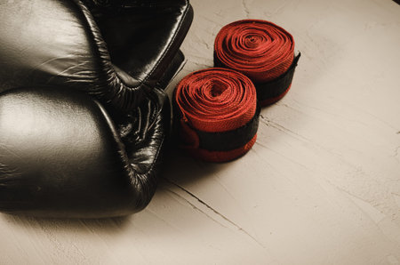 black boxing gloves and red bandage/sport concept with black boxing gloves and red bandage. Copyspace