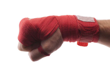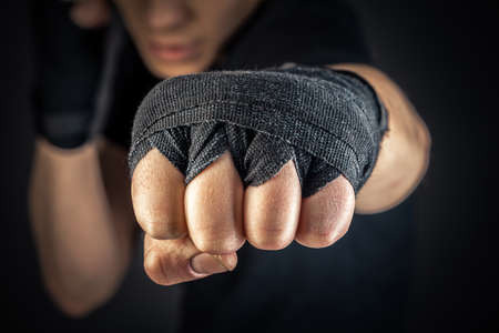 A boxers red bandage on his hand isolated on dark blurred background, close-up.