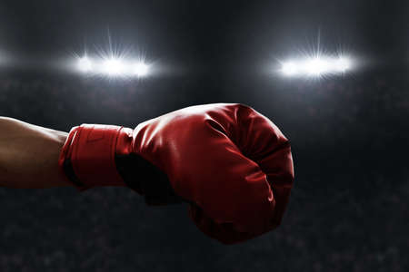 Woman hand in red boxing glove punching over dark background, close up, profile side view
