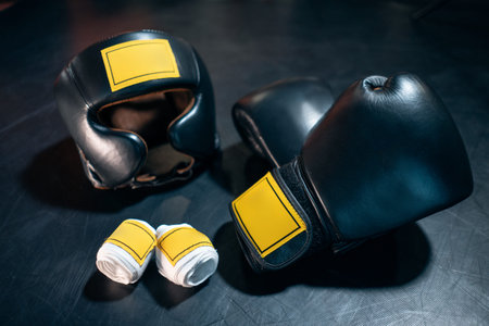 Boxing gloves and helmet. Boxing helmet for training. Boxing hall.