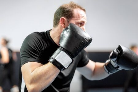 Portrait of Boxer wear boxing gloves, look at camera in fitness gym. Active Caucasian attractive sportsman fighter athlete workout exercise, practice hitting and punching to maintain muscle for health
