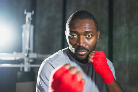 Workout in gym. African man fighter ready for fight punching with boxing wraps protective bandages to camera. Strong man training punches looking concentrated straight preparing for boxing sparring