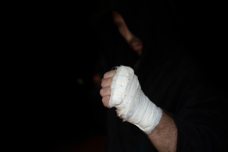 Hands of a boxer with white bandages prepared to fight in a sport battle