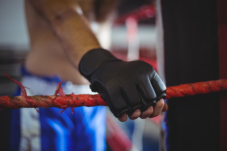 muscular professional kick boxer resting on the ropes in the corner of the ring while training for the next match with a focus on the gloves