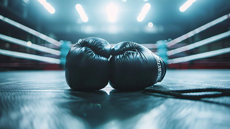 Black boxing gloves in a boxing ring under bright lights. Concept of combat sports, training, martial arts, fitness.