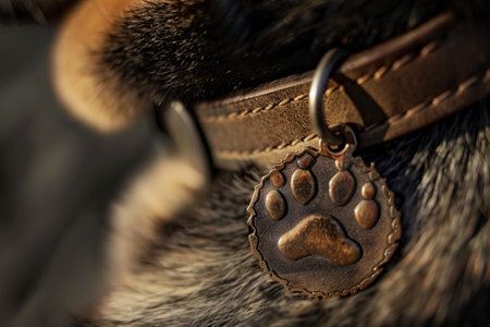 close up of medallion in the shape of paw on the dog collar