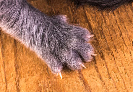 dog feet and legs wooden surface. Close up image of a paw of homeless dog. skin texture. Resting dog's paw close up.