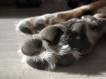 dog feet and legs texture surface. Close up image of a paw of homeless dog. skin texture. Resting dog's paw close up.
