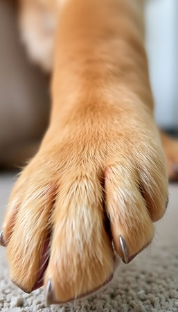 close up of a dog's paw on a carpet