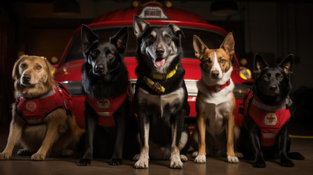 Three dogs are sitting together, looking up with keen interest. Generative AI