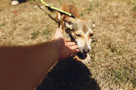 hand of man caress brown scared dog from shelter posing outside in sunny park, adoption concept