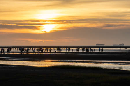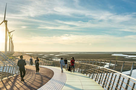 Crowded people playing the water in Gaomei Wetlands during sunset time. Qingshui District, Taichung City, Taiwan