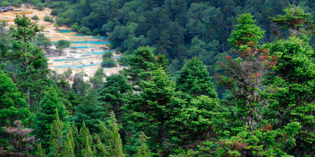 Scenic autumn landscape at the Shuzheng Valley, Jiuzhaigou nature reserve, China. Amazing view of the Bonsai Shoals with emerald crystal clear water among fall forest and wooded mountains in fog.