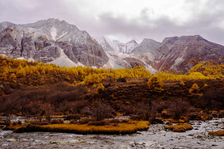 Colorful in autumn forest and snow mountain at Yading nature reserve, The last Shangri la
