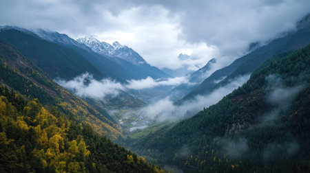 A picture of tranquility in the mountains and countryside, a secret valley shrouded in clouds and mist