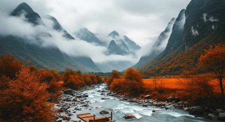 Lush mountains shrouded in clouds, with a serene river flowing through vibrant trees,.