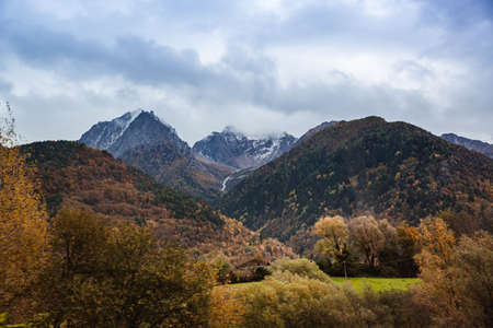 Colorful in autumn forest and snow mountain at Yading nature reserve