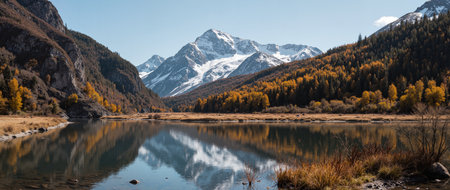Beautiful view of the Rhinoceros Lake among wooded mountains and fall woods in Jiuzhaigou nature reserve (Jiuzhai Valley National Park), China. Snow-capped mountain in background. Amazing snowy peak.