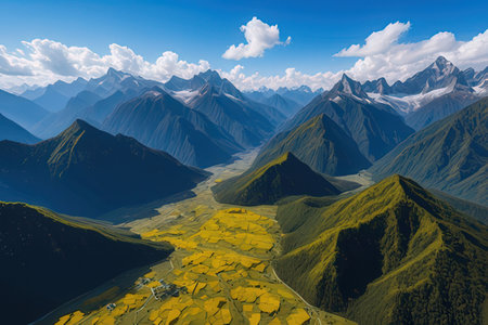 Aerial view of mountains and meadows in Cordillera Blanca, Peru